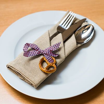 Im Video unten zeige ich euch Schritt für Schritt, wie ihr ganz einfach eine hübsche Bestecktasche faltet – ideal für Feste, Feiern oder besondere Anlässe. Wer möchte, kann die fertige Serviettentasche anschließend noch individuell dekorieren. Im Beispiel oben seht ihr eine Variante für eine Hüttengaudi, verziert mit kleinen Salzbrezeln und einer farblich passenden Schleife.
