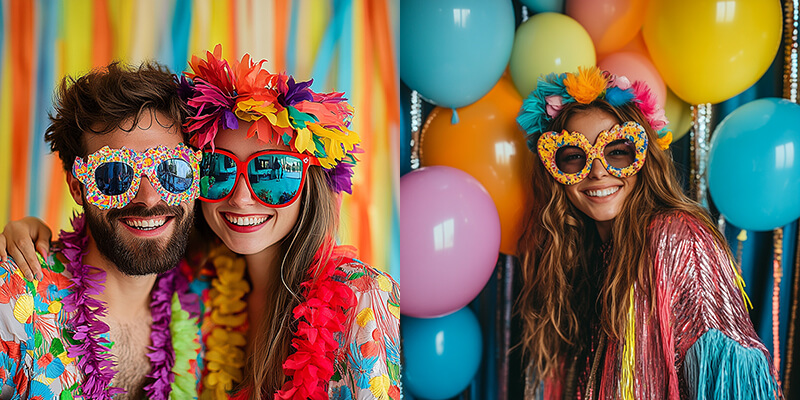 Eine Fotoecke ist zwar kein Partyspiel im eigentlichen Sinne, aber trotzdem eine super Idee um Eure Party aufzulockern. Gleichzeitig entstehen dort wunderschöne Bilder als Erinnerung. Für Eure Fotoecke braucht Ihr nicht viel, nur einen kleinen Tisch oder einen Kleiderständer, wo Ihr ein paar hässliche Accessoires drapieren könnt. Dafür eignen sich Perücken, Krawatten, Sonnenbrillen, Hüte, Haarschmuck und Tücher. Natürlich alles im Bad-Taste-Stil. Wer Zeit und Lust hat, kann auch Requisiten aus Papier basteln, die jeweils an kleine Holzstäbe befestigt werden. Nun können in der Ecke lustige und kuriose Fotos entstehen, die Ihr selber mit dem Smartphone oder einer Kamera aufnehmen könnt. Ein riesen Spaß für alle.
