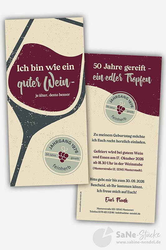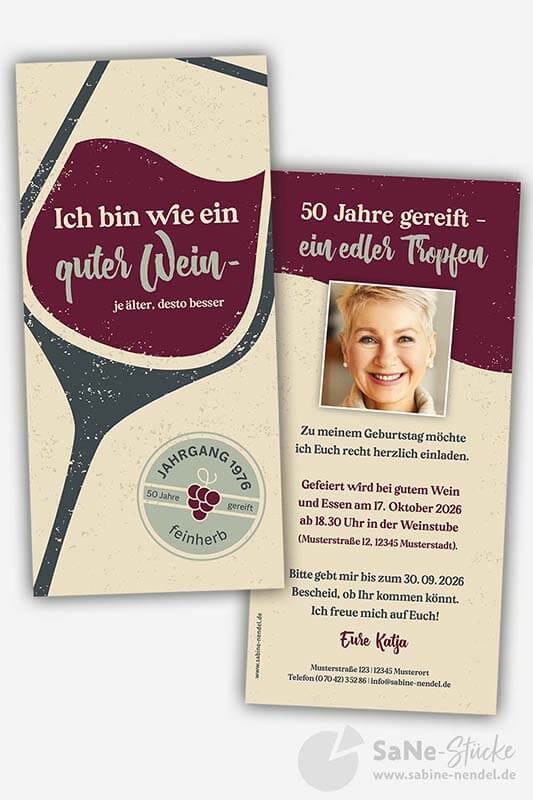 Die Einladung Wein 50 kündigt eine Feier voller Genuss und Spaß an. Mit witzigen Sprüchen, Retro-Design und persönlichem Weinprofil wissen deine Gäste sofort: Hier wird gelacht, getrunken und gefeiert!