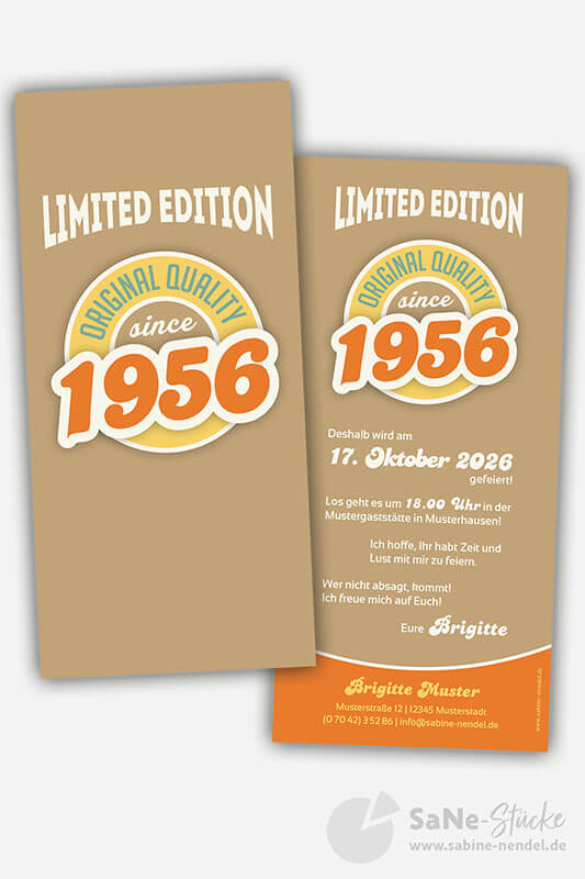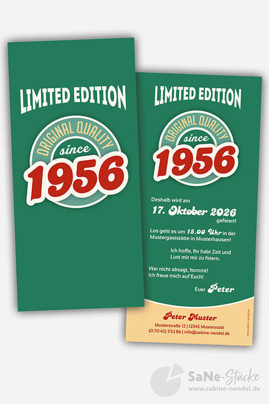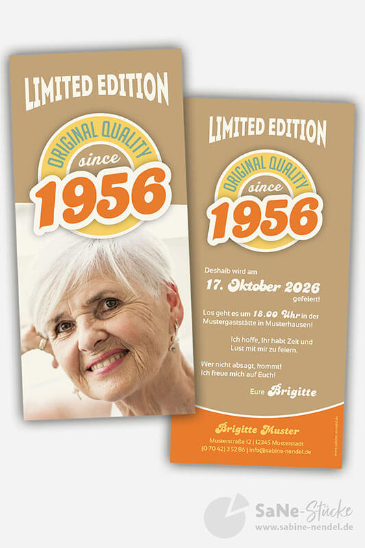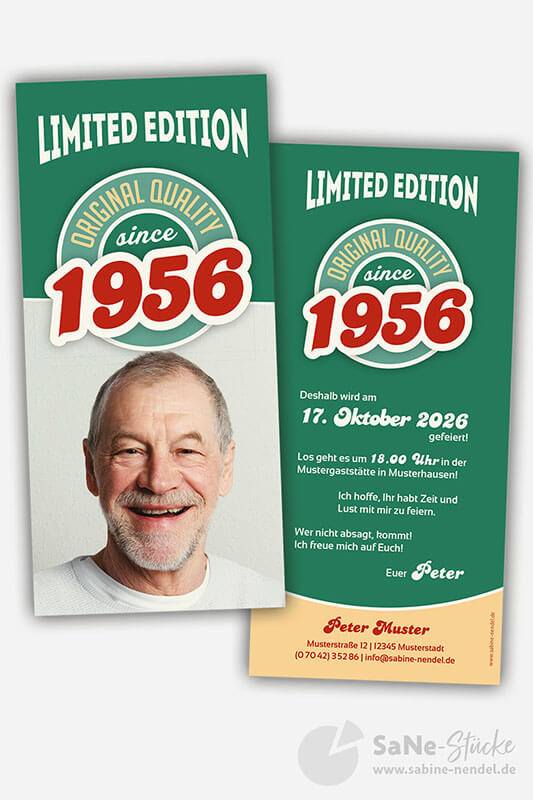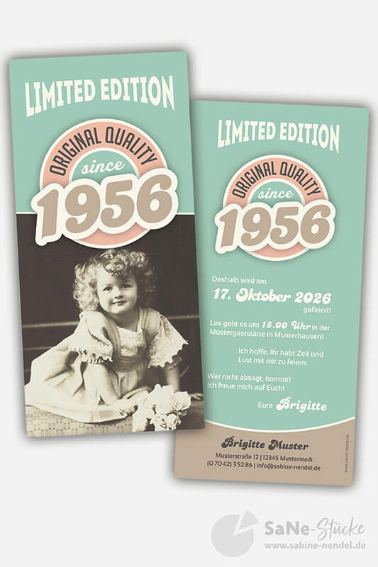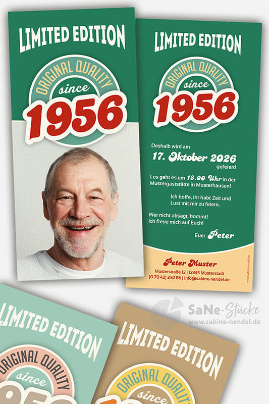 Auf der Einladung hat es Platz für ein Kinderfoto von Ihnen oder ein aktuelles Bild. Und für alle, die kein Foto von sich auf der Einladung möchten, schlicht und schick nur mit Ihrem Jahrgang. Auf Wunsch mit jedem beliebigen Geburtsjahr, einfach bei der Bestellung mit angeben. Die Retro Einladung erhalten Sie in den drei verschiedenen Farbkombinationen grün, blau oder braun.