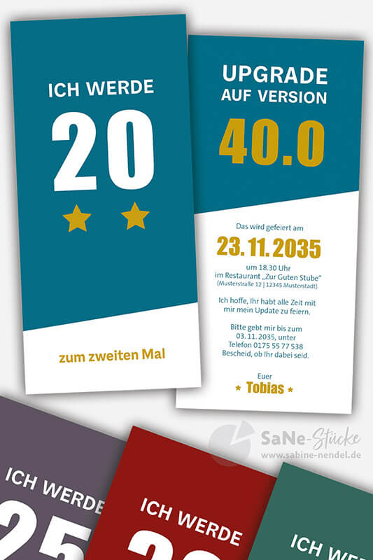 Humorvolle Einladung zum Geburtstag. "Ich werde 20 zum zweiten Mal - Upgrade auf Version 40.0" als Beispieltext zum 40. Geburtstag. Texte werden jeweils auf Ihren Geburtstag angepasst. Gerne auch mit Foto auf der Einladungskarte. In vier Farben erhältlich, auch in Ihrer Wunschfarbe.